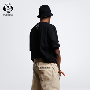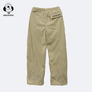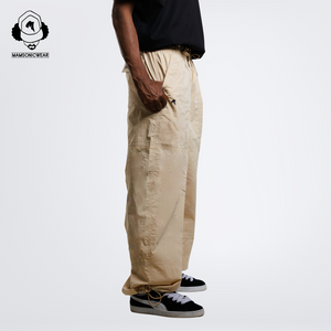 The Embroidered Logo Draped Crinkle-Cotton Cargo Pants, crafted from a designer-favored cotton crinkle fabric renowned for its lightweight drape. Features a straight silhouette with pronounced center leg seams that reinforce structure for enhanced durability while visually elongating and straightening the leg line. Functional details include generously deep snap-closure slanted front pockets—accented by 'M' embroidery beneath the right pocket—along with a single back right flap pocket secured by a snap closure and adorned with refined brand logo embroidery on the flap; the waistband is equipped with two custom premium metal pig nose buckles for easily adjustable, secure sizing that stays firmly in place, while both cuffs incorporate hidden yet high-quality lightweight pig nose buckles for discreet ankle-width adjustment, completing the utilitarian yet polished design.
