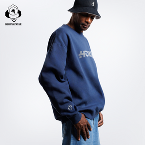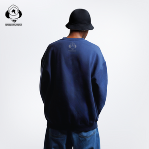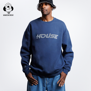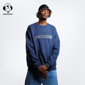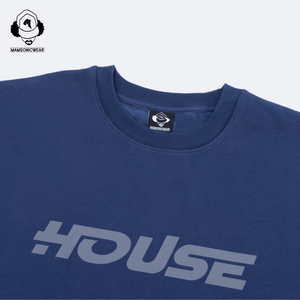 The HOUSE Crewneck is made from heavy 340gsm core fleece cotton blend, eye-catching dark blue with soft-touch silver-grey “HOUSE” logo on front and a complete brand image on the back collar. The signature MAMSONICWEAR fit is evident with a relaxed silhouette, dropped shoulders, rib-knit collar, cuffs and waist hem.Furthermore, the exquisite 3D rubber character emblems on the cuffs and the smooth-edged, zero-irritation neck labels crafted from premium materials, each detail whispers our commitment to excellence.